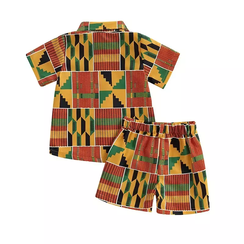 Deixe o estilo e a cultura caminharem juntos com este lindo conjunto infantil! Composto por camisa de manga curta e bermudinha, traz uma estampa vibrante inspirada nos tradicionais tecidos africanos, cheia de cores vivas como amarelo, vermelho, verde e preto.